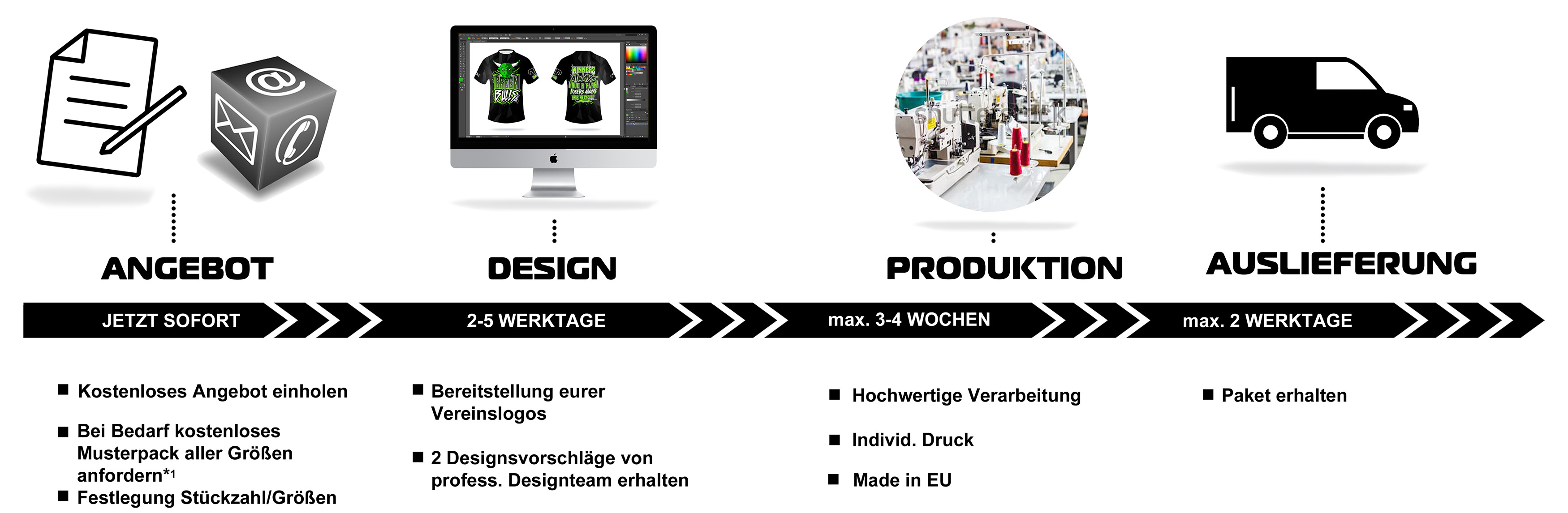 Ihr könnt dazu aus einer breiten Produktpalette auswählen, die wir permanent erweitern. Für unsere Produkte haben wir nur die besten Stoffe ausgewählt und die Schnitte so angepasst, dass sie die höchsten sportlichen Ansprüche erfüllen. Die Mindestbestellmenge liegt bei den meisten Produkten mai bei insgesamt 10 Stück (unabhängig der Anzahl der Großsen).